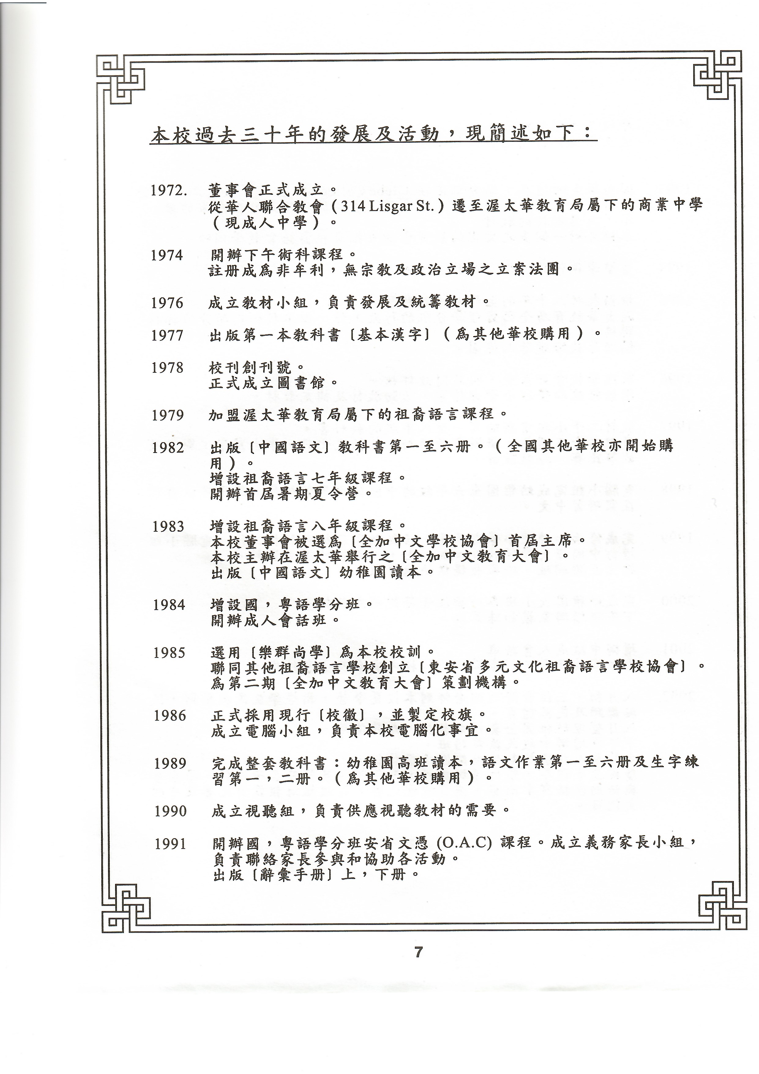 增辦國語、粵語學分班之安省高中文憑(O.A.C.)課程。成立義務家長小組,推動家校合作。出版《辭彙手冊》上、下冊。
