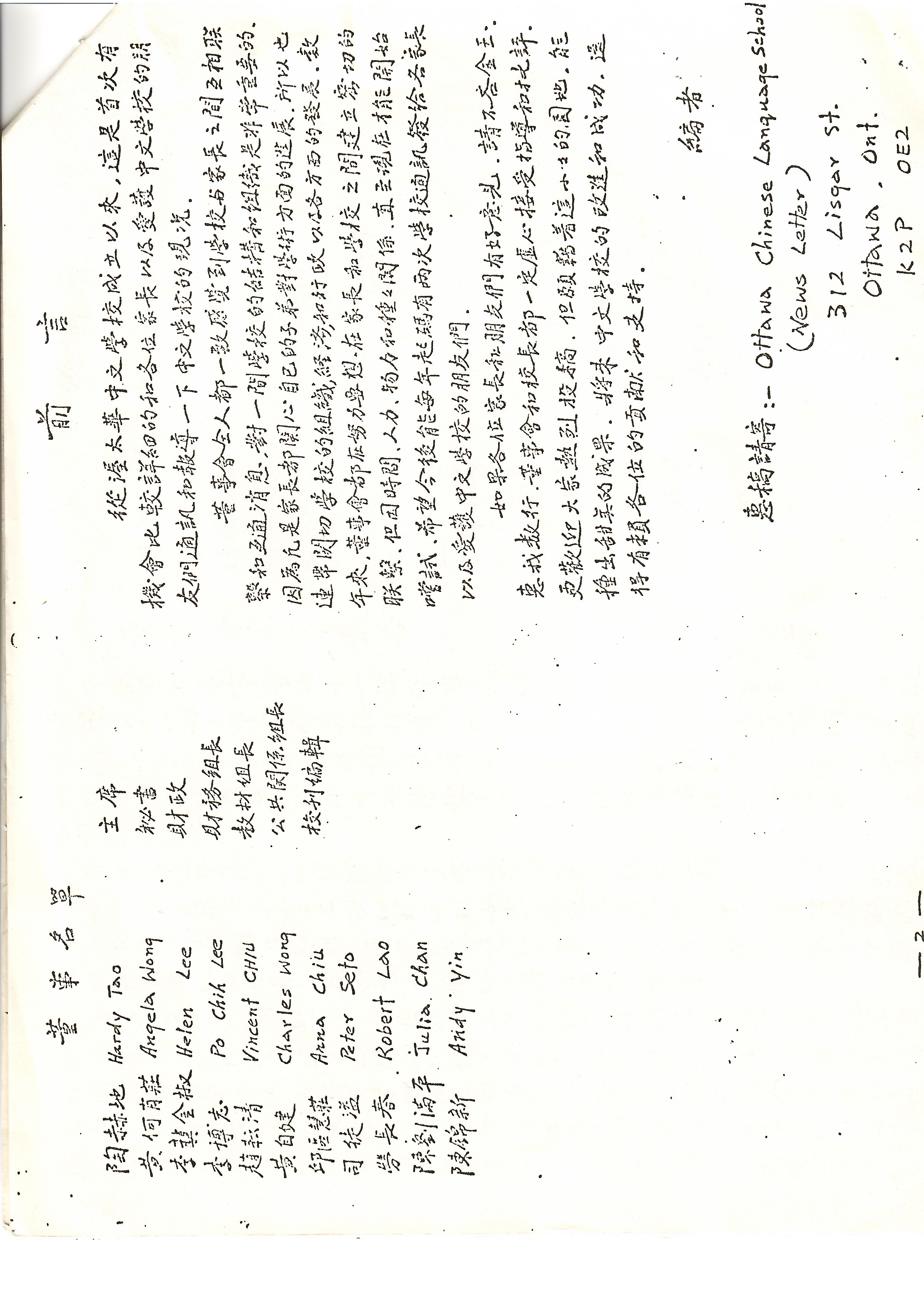 Adopted the motto “Learning with Joy and Aspiration.” Co‑founded the Eastern Ontario Multicultural Heritage Language Schools Association and took part in planning for the National Conference on Chinese Education.