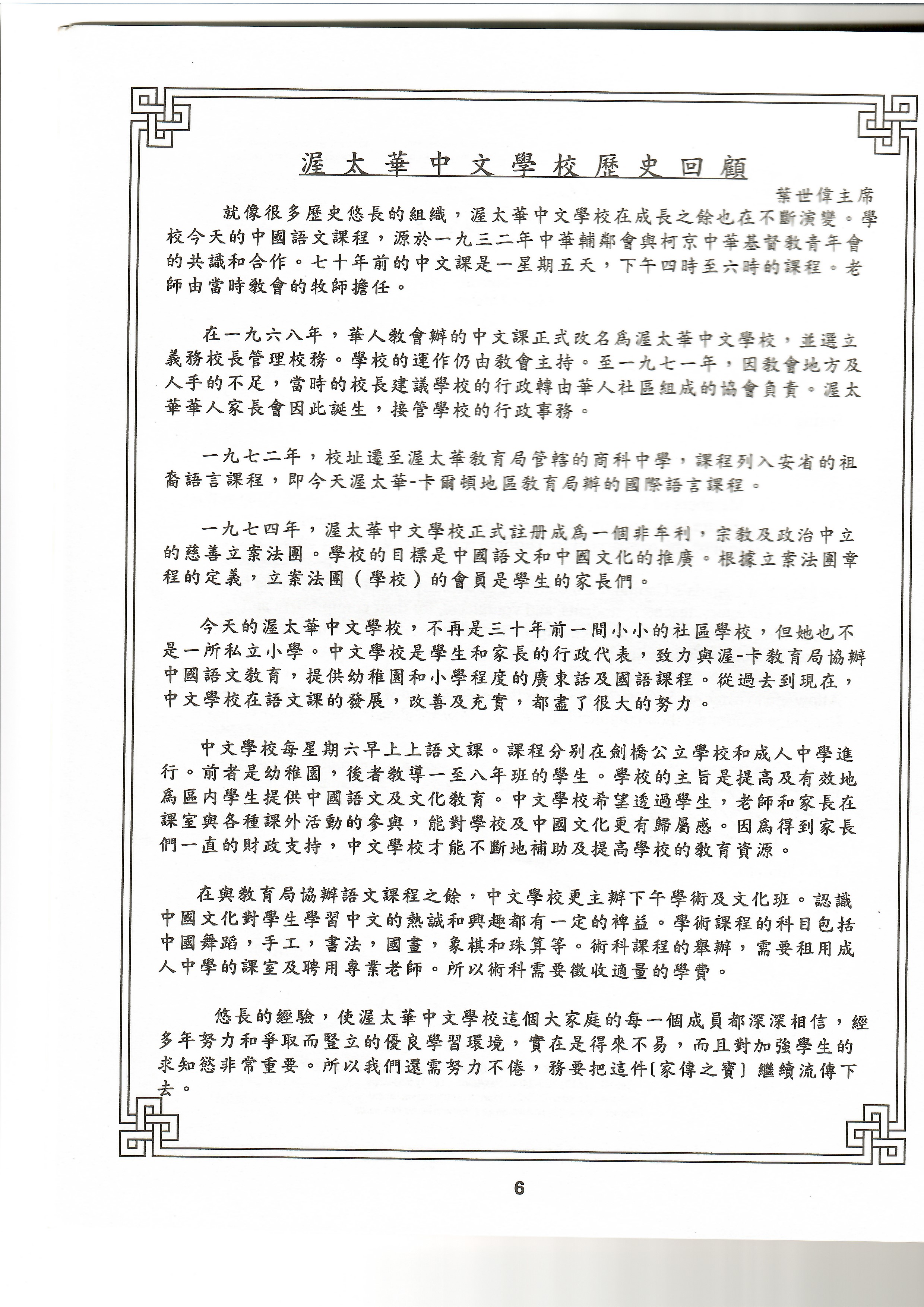 Adopted the motto “Learning with Joy and Aspiration.” Co‑founded the Eastern Ontario Multicultural Heritage Language Schools Association and took part in planning for the National Conference on Chinese Education.