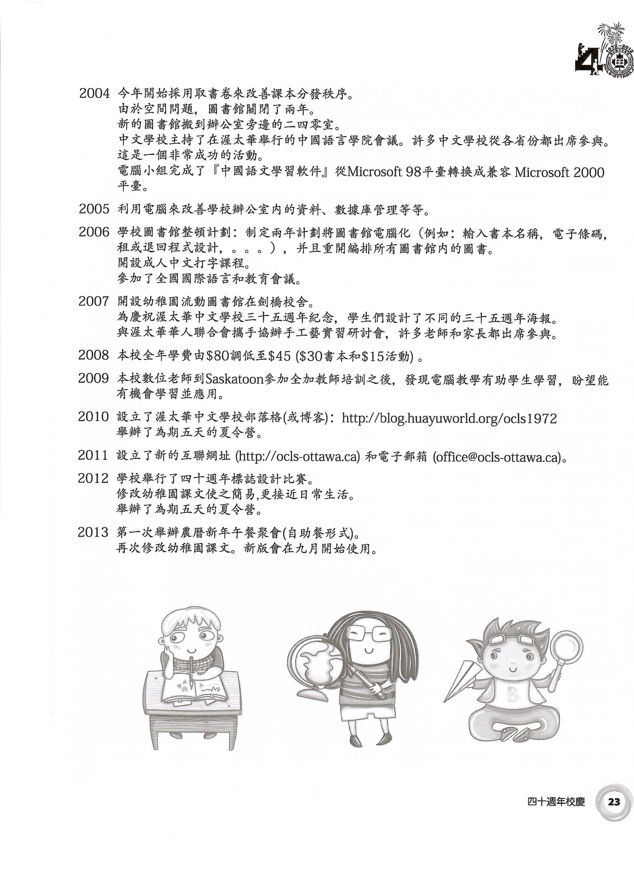 開始以行動書車服務在劍橋校舍(待核);為慶祝學校三十五週年,學生設計了不同的三十五週年海報/標誌;與華人學聯合辦教師千里學習研討會,許多老師家長參與(待核)。
