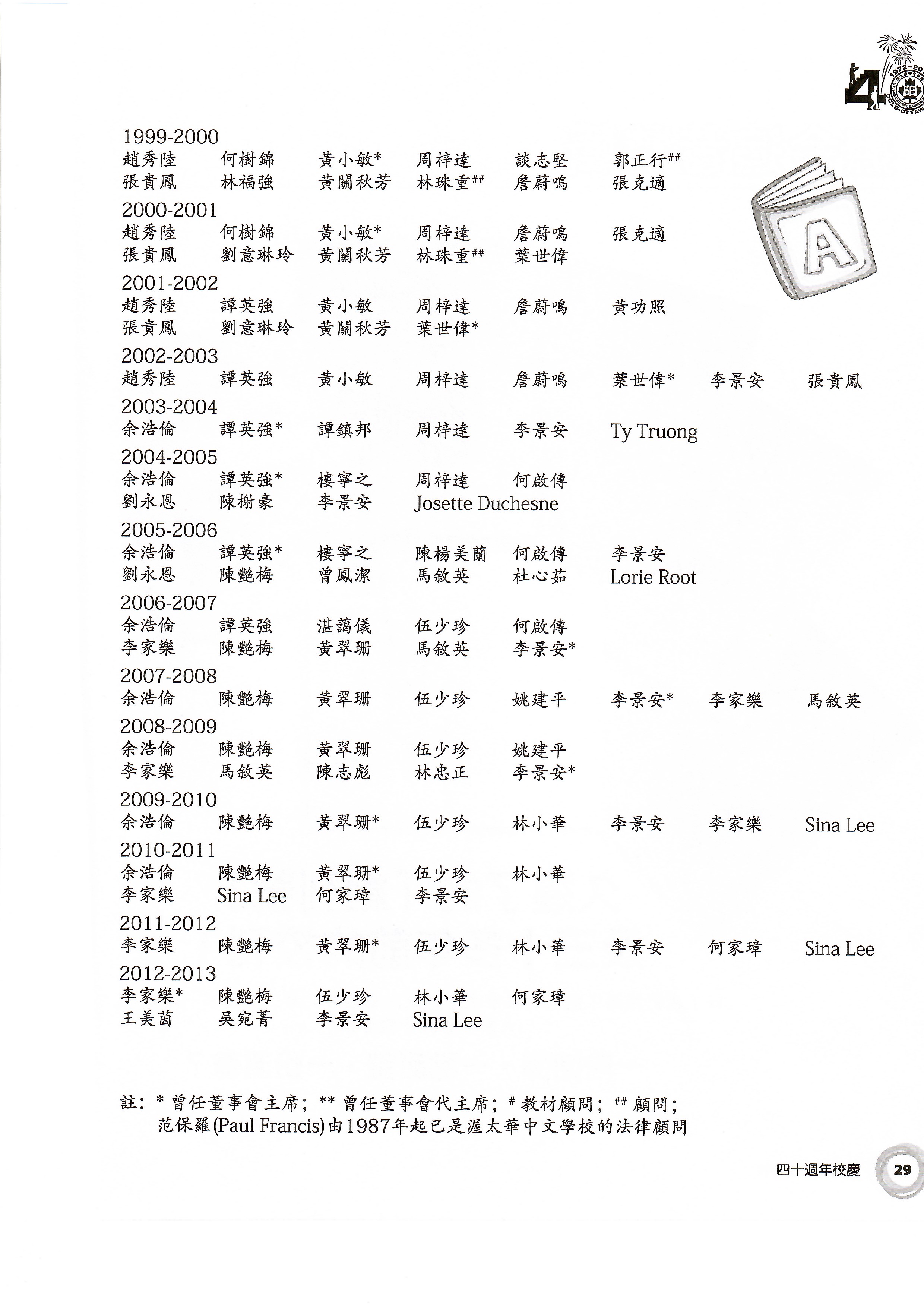 Introduced Ontario Academic Credit (O.A.C.) courses for Mandarin and Cantonese streams. Formed a Volunteer Parents Group to strengthen home‑school collaboration. Published the two‑volume Vocabulary Handbook.